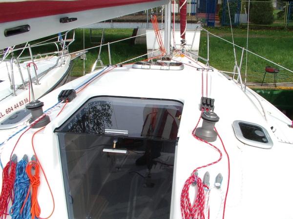 - komplet żagli: grot na pełzaczach, fok z rolerem na sztywnym sztagu, kabestany samoknagujące, pokrowce bomowe z "Lazy Jacky'ami",sztormrelingi, bramka do opuszczania i stawiania masztu z wantami w osi obrotu, instalacja elektryczna: oświetlenie 12V, akumulator, gniazdo 12V, prostownik, przedłużacz 230V - 15 m, gniazdo 230V (działa po podłączeniu do sieci)