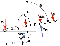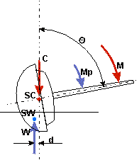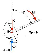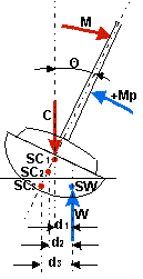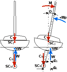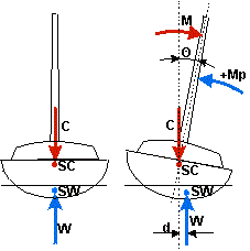 Na jacht działa moment M pochodzący od siły aerodynamicznej powstającej na żaglu. Jest to moment przechylający któremu przeciwdziała moment prostujący Mp. Przy przechyleniu jachtu o kąt O środek wyporu SW przemieszcza się w kierunku pochylenia dając ramię d o które siły C i W zostały przesunięte względem siebie. Moment prostujący Mp daje się określić wzorem: