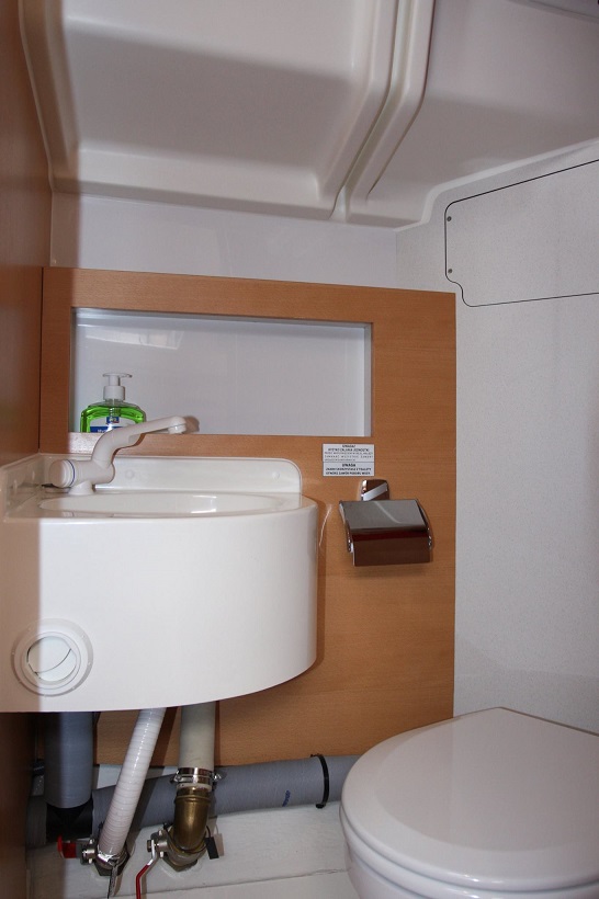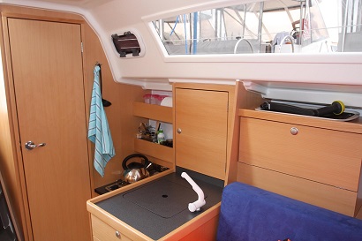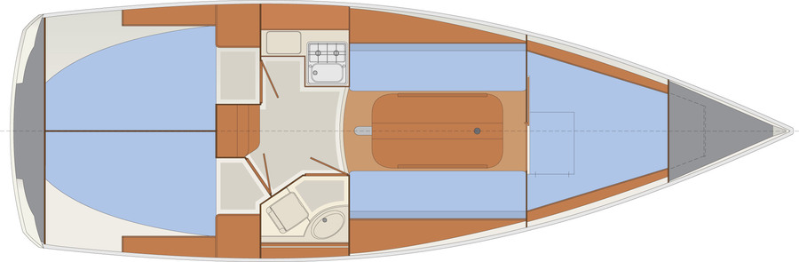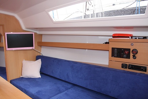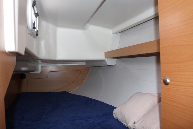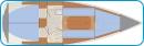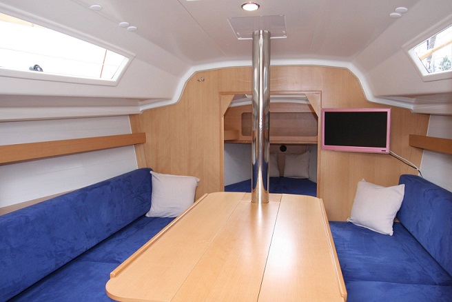 - Zamykana kabina dziobowa z dwuosobową koją oraz dużą otwieraną bakistą, dwie koje w mesie, dwie zamykane kabiny rufowe z podwójnymi kojami i szafkami