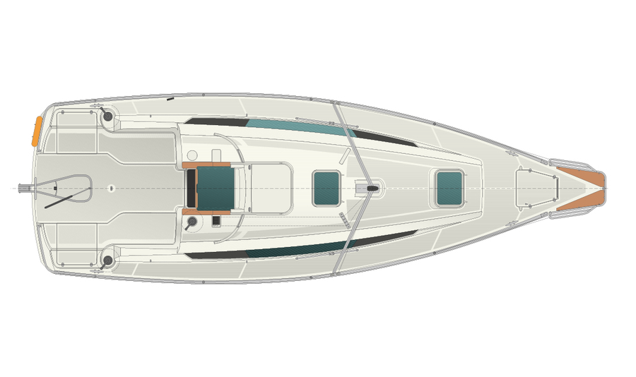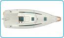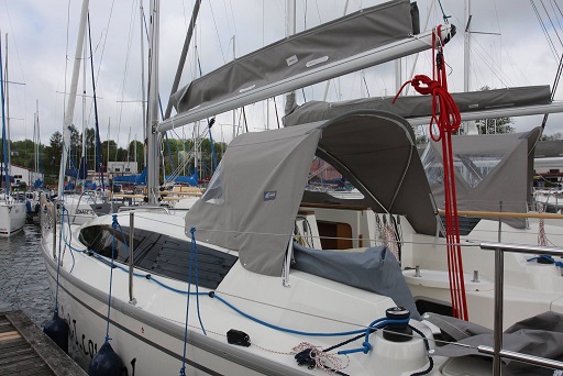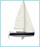 - Fok na liklinie, grot na pełzaczach, listwy krótkie, dwa refy, Lazy Bag + Lazy Jack, roler na sztywnym sztagu, Tent